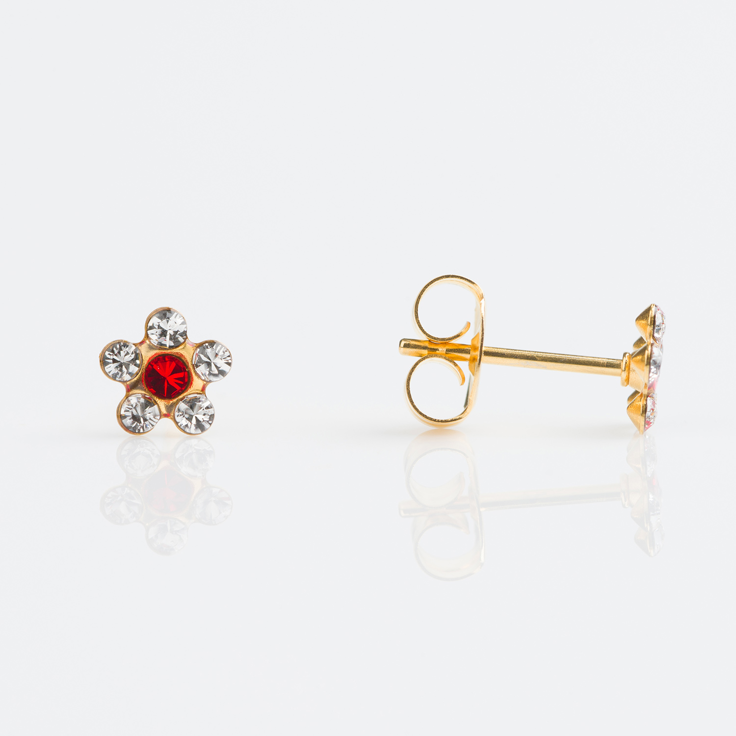 Tiny Tips Gold Plated 5mm Daisy April Crystal earrings bring a delicate daisy sparkle to everyday wear. Designed in a petite 5mm size, they suit smaller ears and subtle styling. The outer stones shine in clear crystal, while the centre stone adds a ruby-toned accent for a bright, floral finish. Each pair is supplied sterilised and sealed for hygiene and peace of mind.